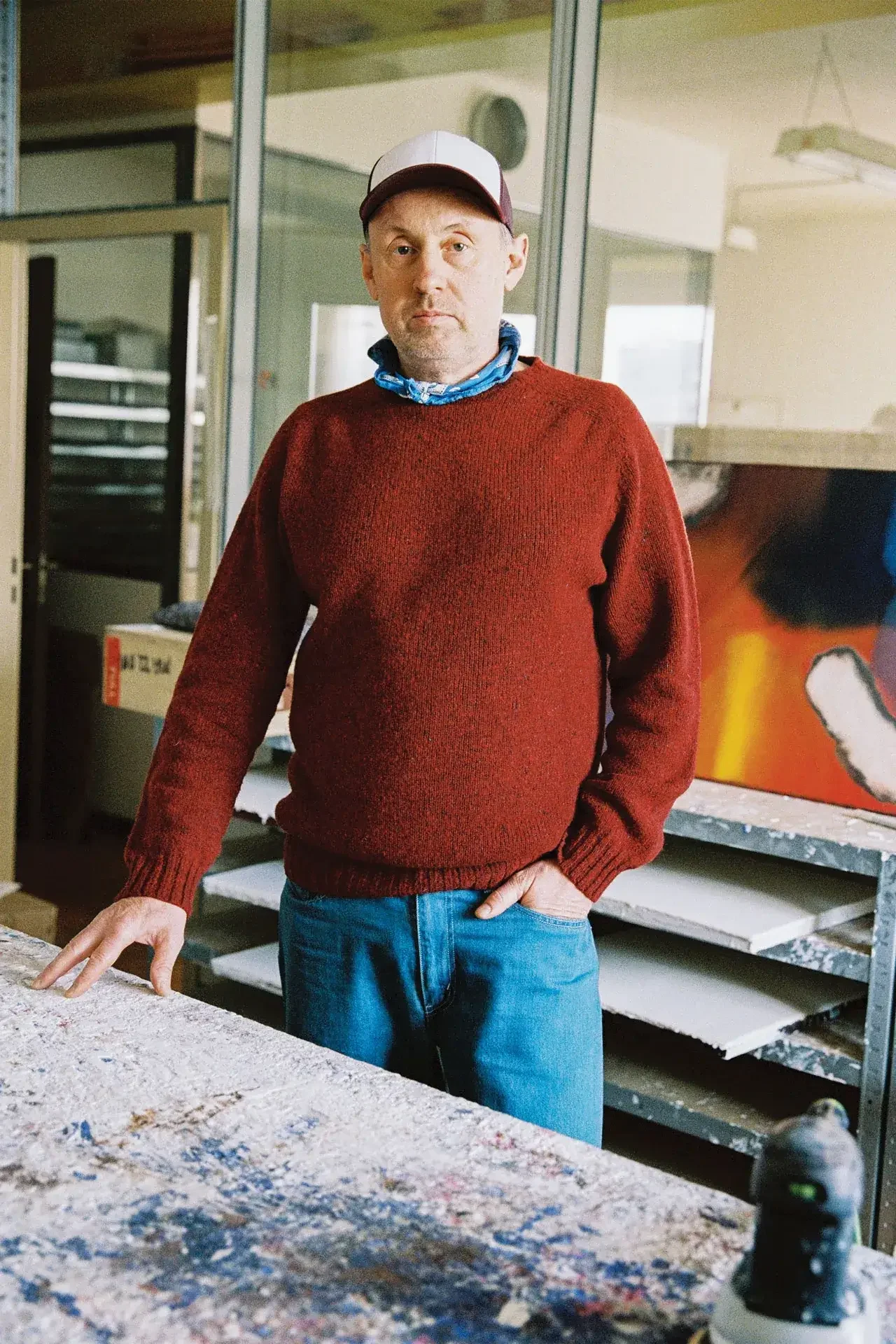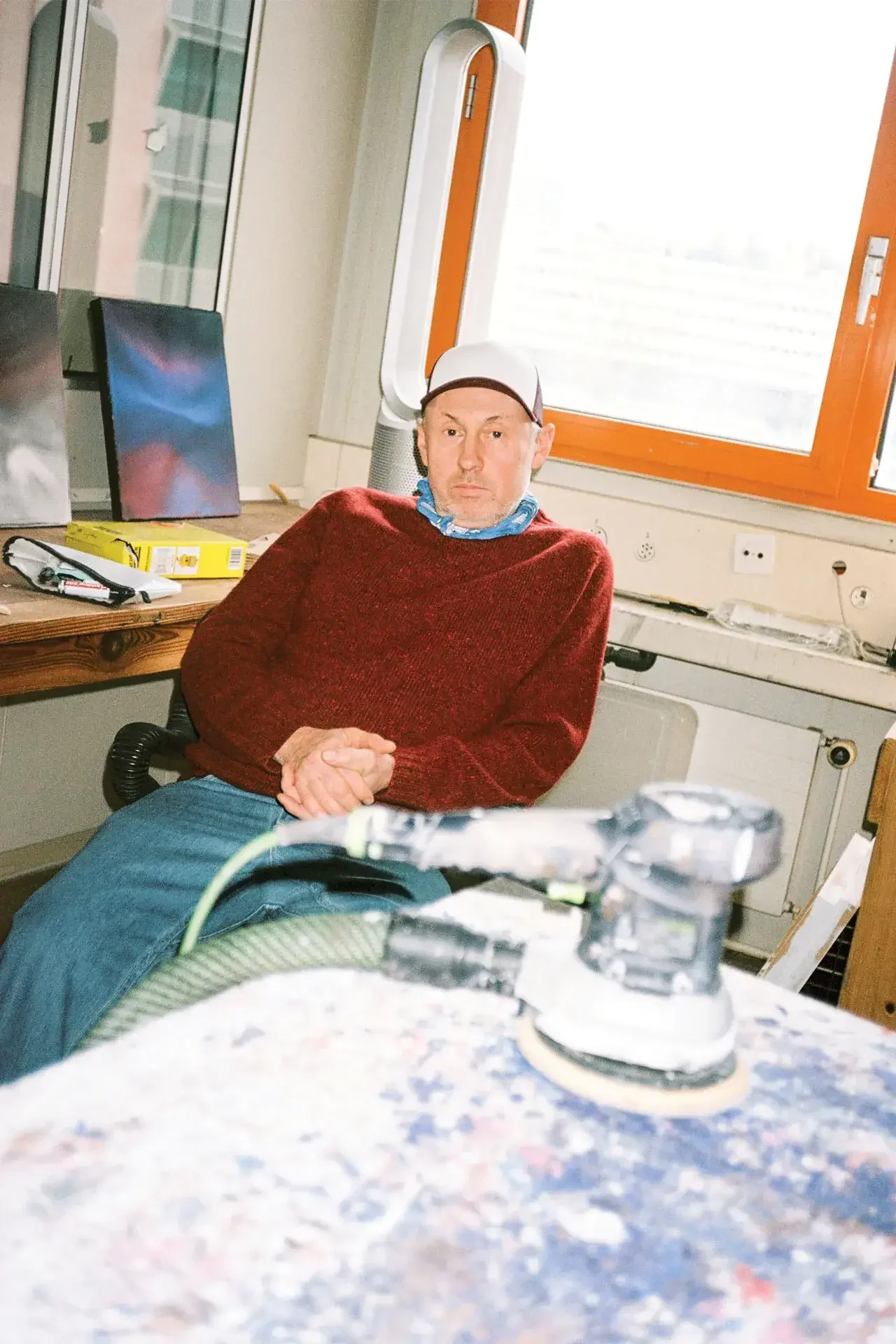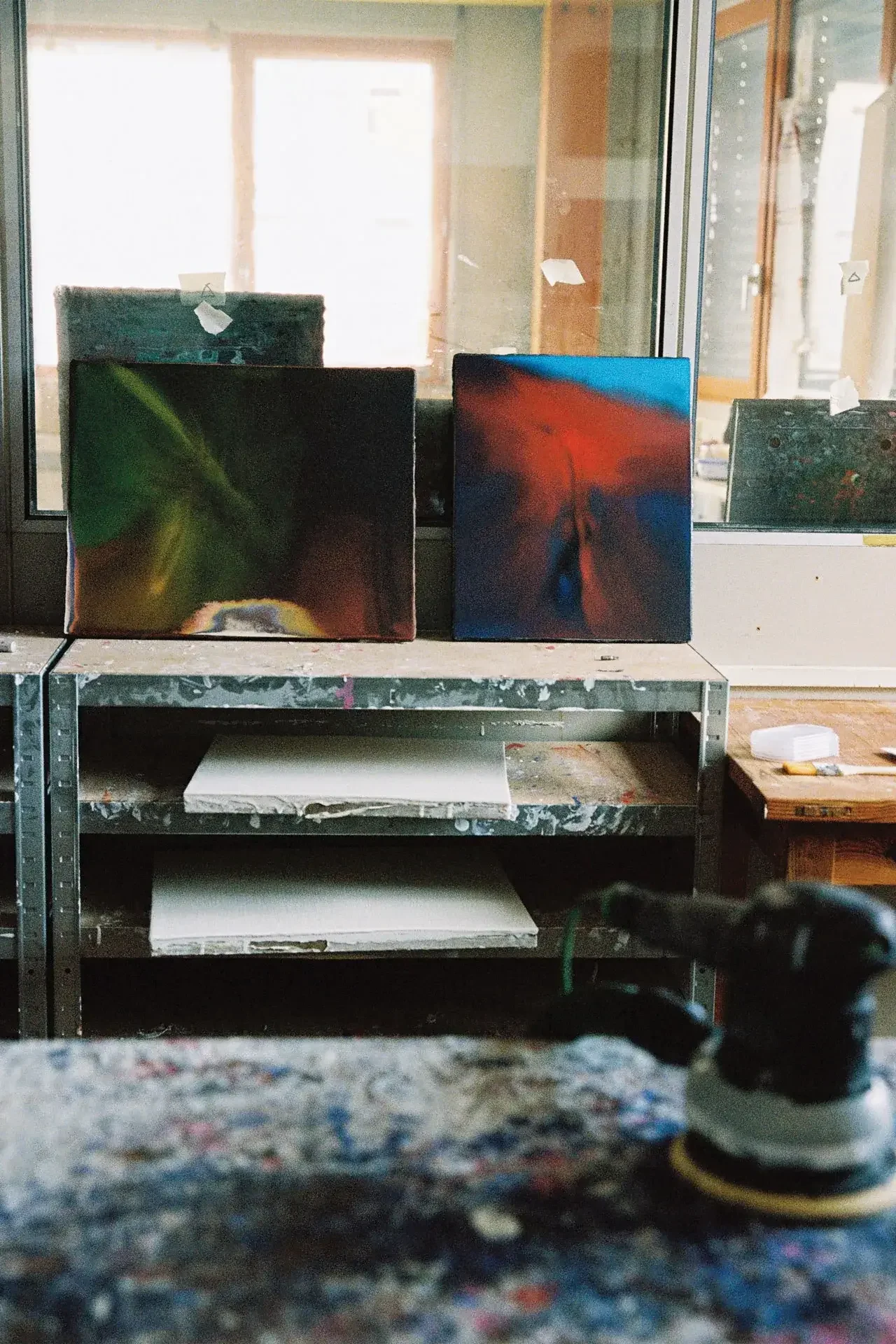 Mon atelier se trouve dans la zone industrielle des Acacias. C’est amusant car depuis 25 ans, j’ai pour habitude de traverser des ateliers de mécanique avant d’arriver à mon studio. Il y a une très belle vue sur le Salève à droite et le Jura à gauche et les couchers de soleil y sont parfois incroyables. Je crois en cette pratique quotidienne de l’atelier. Même si je n’ai rien à y faire – ce qui heureusement arrive rarement – je lis, j’écoute de la musique, je regarde par la fenêtre. Le studio est une sorte de machine qui, à un moment donné, fonctionne automatiquement et je fais partie de cet engrenage.