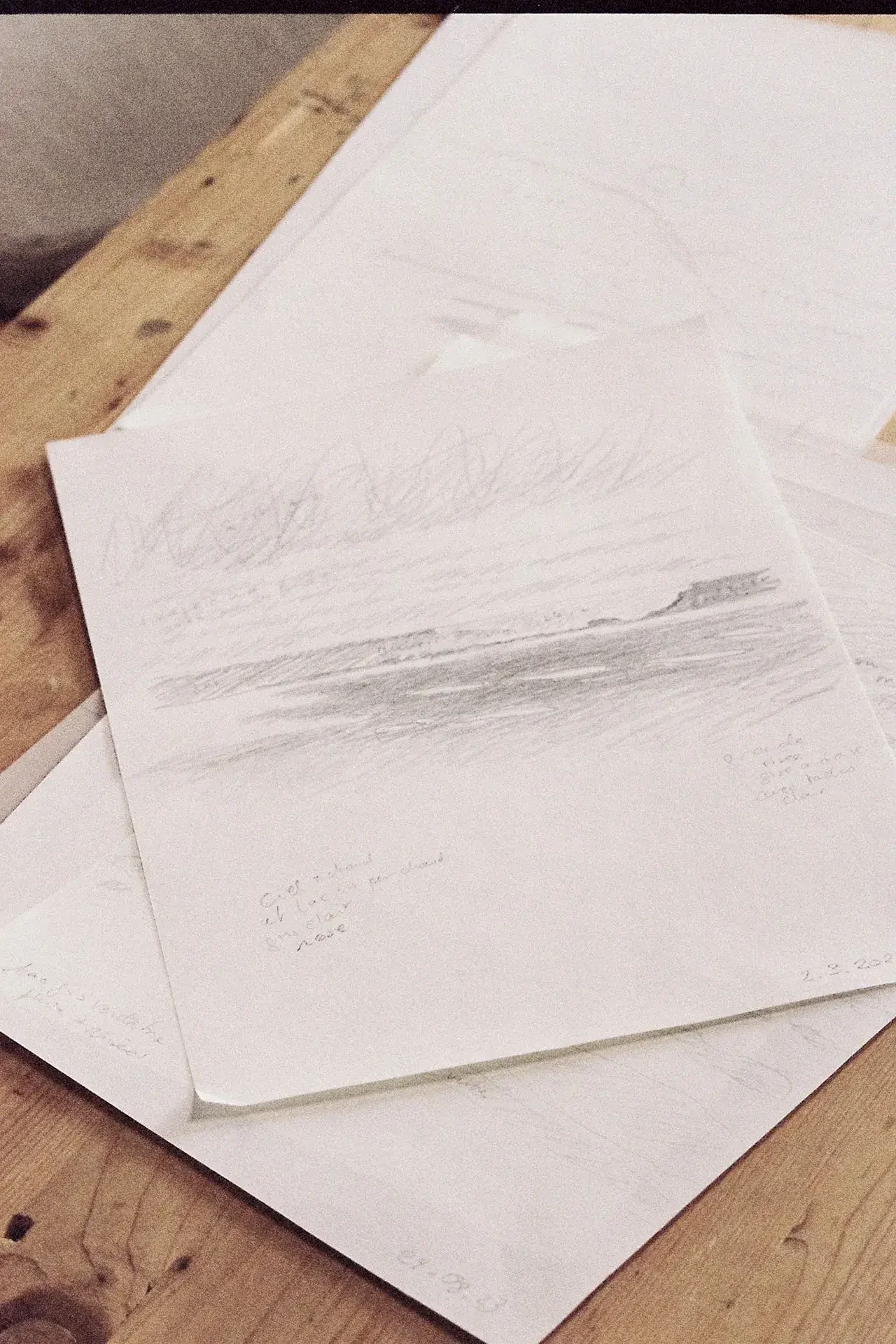 Ce qui m’intéresse, c’est la relation directe entre ma position dans l’espace et ce que je vois. Je dessine debout, face au lac, très rapidement. Tout est fluide, immédiat: une feuille A4 verticale, quelques lignes, et ce que je ressens. Pas de naturalisme. Dans la spontanéité du geste, il y a quelque chose de juste, d’irréductible. Ce sont des notations presque musicales, qui me permettent ensuite de transposer en peinture. Ces dessins, ce sont des partitions.
